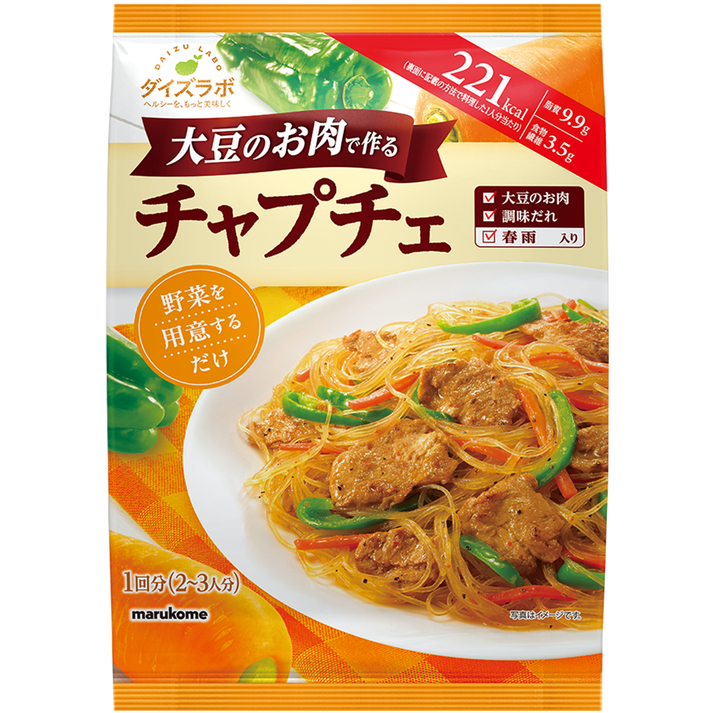 大豆のお肉[大豆加工品(国内製造)(大豆)果実酢たまねぎペースト(一部に大豆を含む)]チャプチェのたれ[醤油砂糖(原料糖黒糖)ごま油還元水飴塩こうじ米みそ食塩おろしにんにく果糖ぶどう糖液糖豆みそたん白加水分解物黒こしょう唐辛子/酒精増粘多糖類セルロース乳化剤加工デンプン(一部に小麦・ごま・大豆を含む)]春雨[緑豆でん粉ばれいしょでん粉]